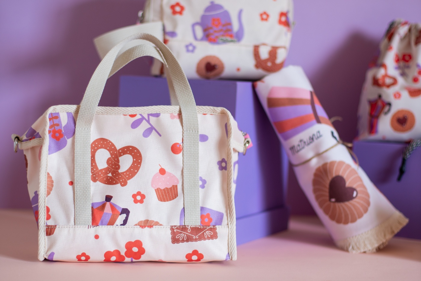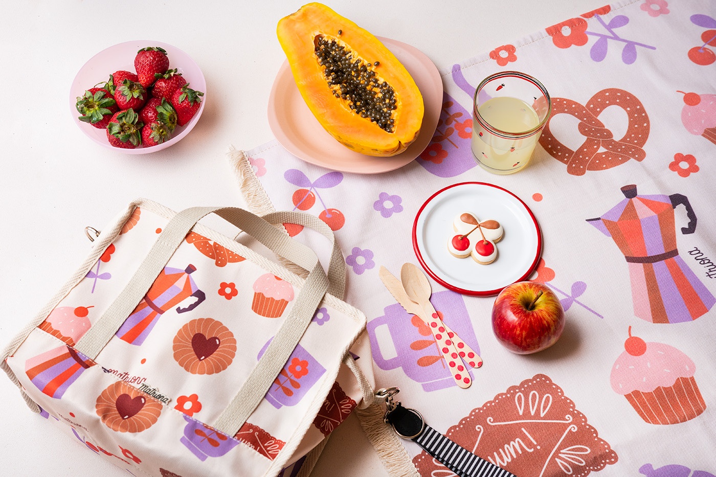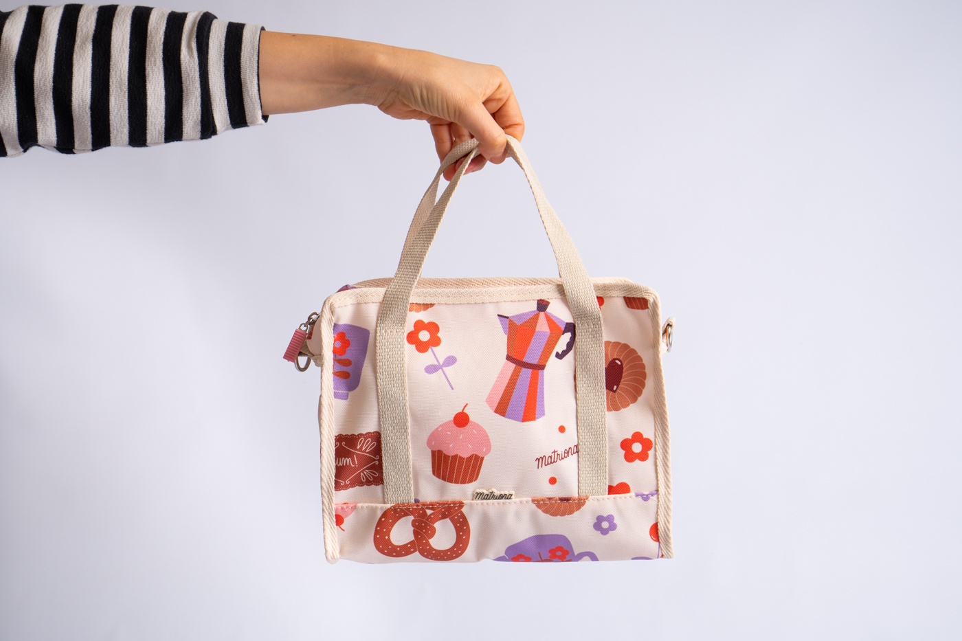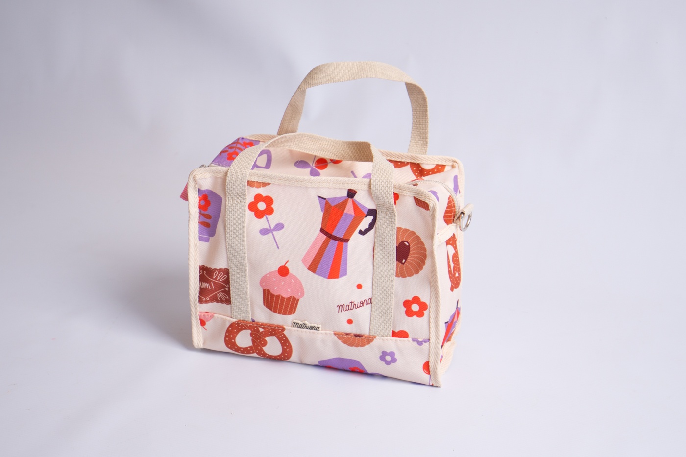Contenedor confeccionado en tejido de Cordura estampada con ilustraciones exclusivas de Eugenia Hernandez para Matriona. Este tejido es ideal para limpiarlo con un paño. Su interior es de fácillimpieza como el exterior.