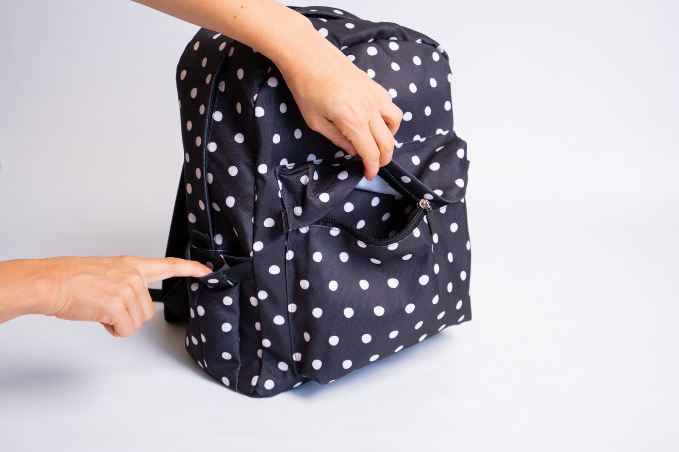 Posee 2 bolsillos laterales pensados para colocar botellas y un bolsillo frontal con cierre para elementos